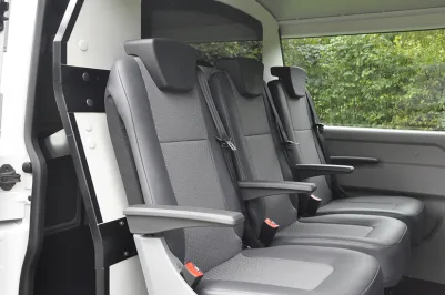 Cabine totalement isolée de la partie arrière par une cloison de protection complète, avec banquette pré-formée 3 ou 4 places arrière avec accoudoirs relevables et appuis-tête intégrés, la cabine ConfoCab vous offre en version de base :